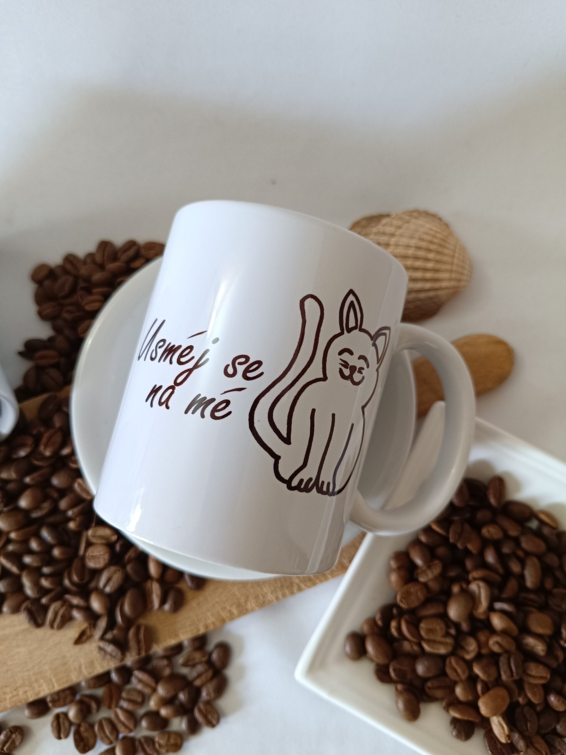 Hrnek s vtipným potiskem USMĚJ SE NA MĚ, s motivem kočičky je vhodný nejen pro milovníky koček.