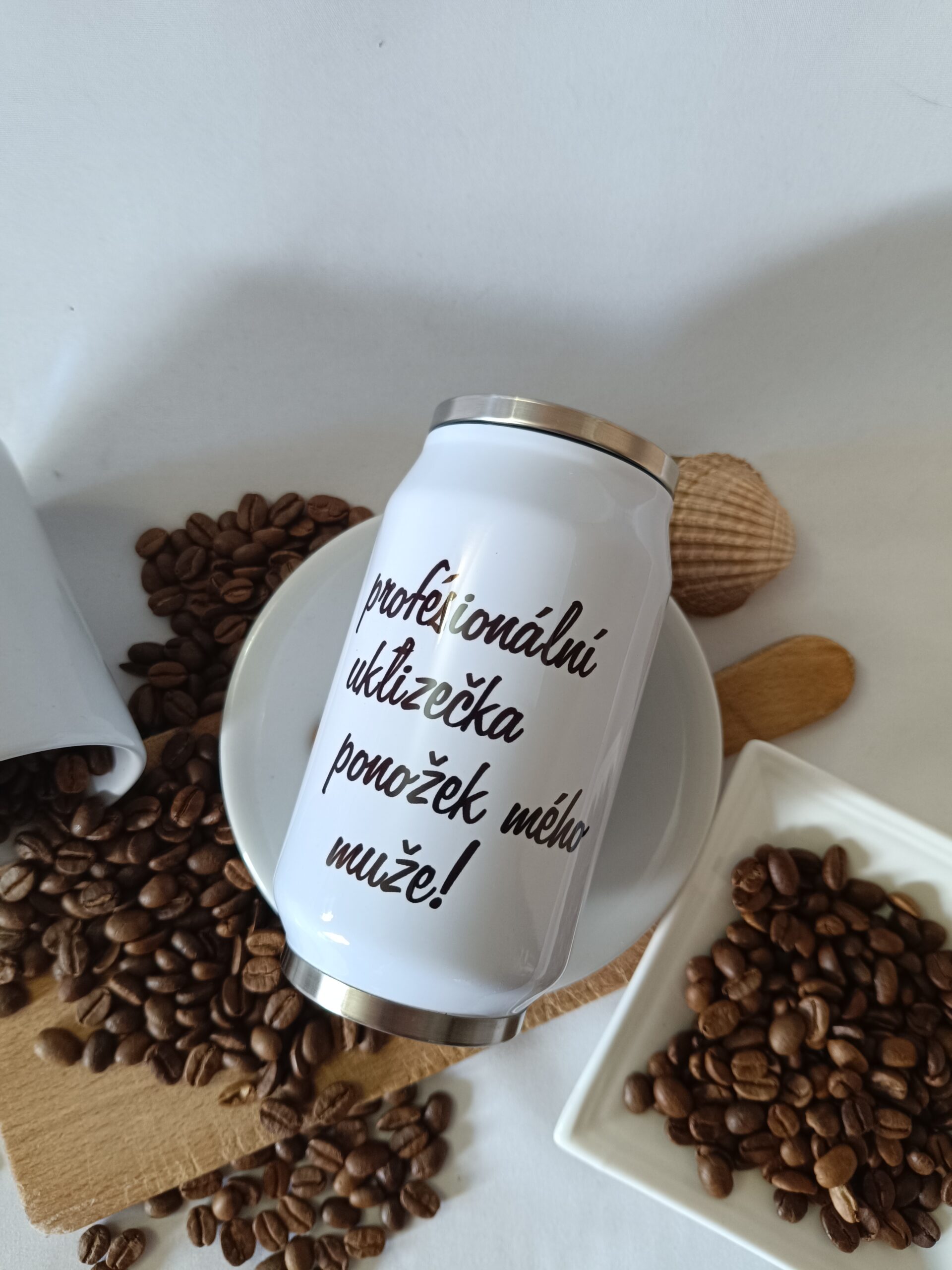 Termoska ve tvaru plechovky s potiskem PROFESIONÁLNÍ UKLIZEČKA MANŽELOVÝCH PONOŽEK.